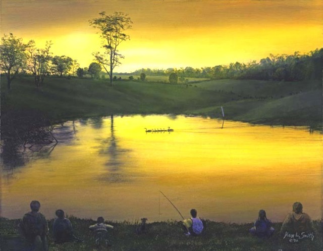 Created from photos taken from a scene of a sunset over a farm pond and a resident family of Canadian Geese swimming across the water. Note the parents watching over their young - while being observed by another family on the bank of the pond.