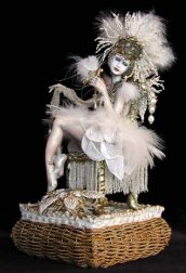 Marilyn Radzat has been creating art in the figure form for over 25 years. She uses the body as the canvas, transforming the sculpted piece with layers of fabric, nature's elements, and found objects. Marilyn's masterful skills in the art of assemblage adds her characteristic emphasis to the dimensional collage. Marilyn's work can be seen in many fine galleries throughout the United States and in the private collections of such well-known personalities as President and Mrs. Clinton, actress Demi Moore, author Anne Rice, entertainer Richard Simmons, director Ron Howard, to name but a few. Each piece stands as a one-of-a-kind collectable, unique and enchanting. The clays used range from low-fired, oil base clays to high fire porcelain. The fabrics used to create the costumes are vintage and antique pieces of silk velvets, rich brocades and other rare textiles. Artist's Statement: I am often called a Curator of Enchantment. I feel that Enchantment offers, in her very essence, inspiration. It is that serendipitous coming together of the unexpected . . . a tiny orange mushroom on the forest floor, a circle of young redwood trees forming a cathedral space, a flash of silk caught by a branch . . . I believe in Enchantment in her highest form. Not as an escape from reality, but as a window into what is possible in that fertile and complex world of imagination. Marilyn Radzat |